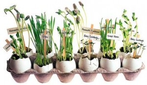 Use eggshells as pots to start seeds and coffee-stirrer tags to label the plants. Plant seeds according to package instructions, and nestle planters in an egg carton on a sunny windowsill, where they can be watered easily. When plants have grown to about 3 inches and have at least two sets of true leaves, they are ready to be transplanted to the garden. (Place in the dirt and break off eggshells first.)