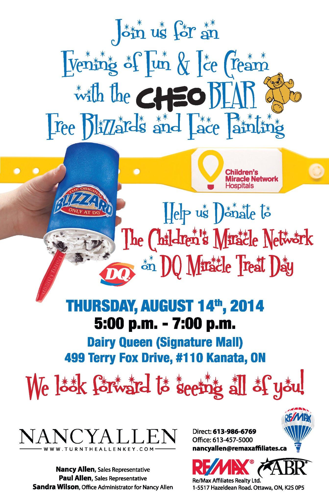 On Thursday August 14th, 2014, $1 or more from every Blizzard Treat purchased at participating DQ stores will be donated to CHEO to help children in need.